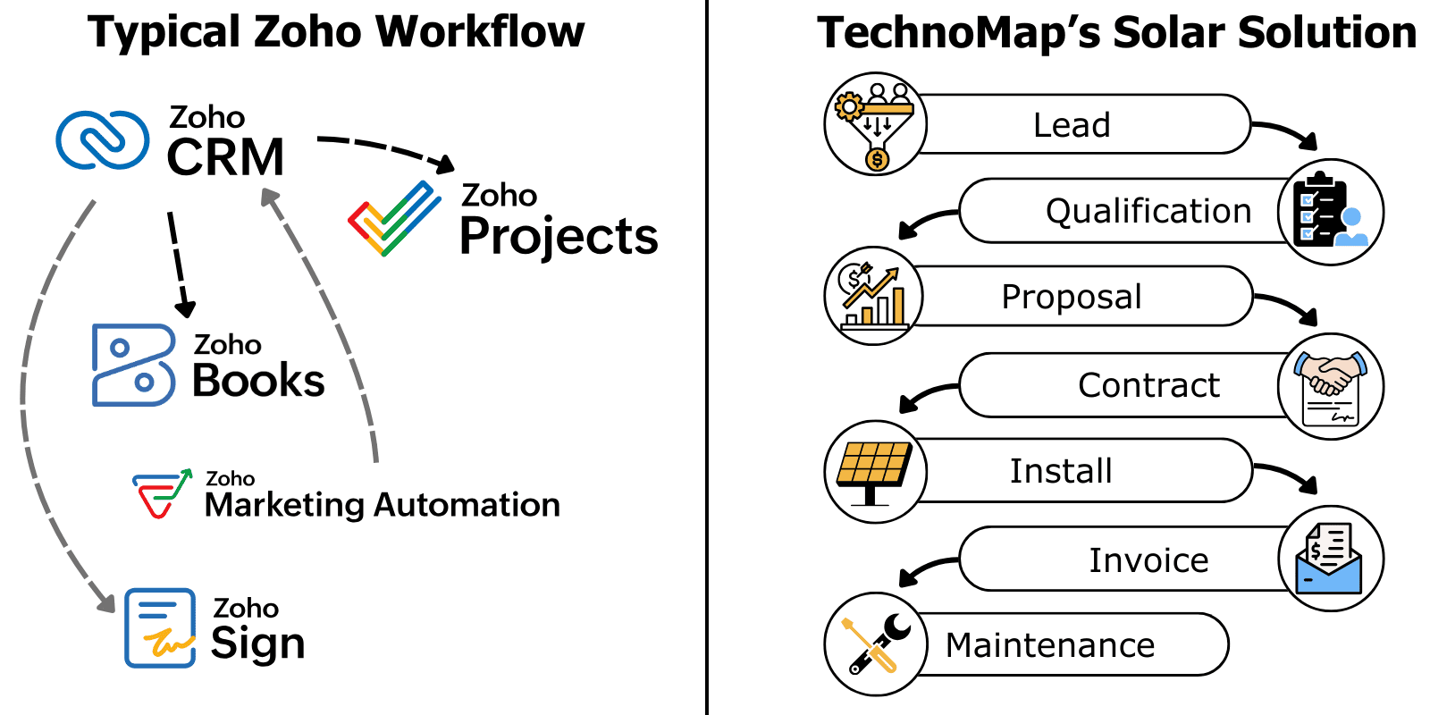 TechnoMap helps solar companies design Zoho One into a single connected operating system so sales, operations, finance, and leadership are finally working from the same source of truth.